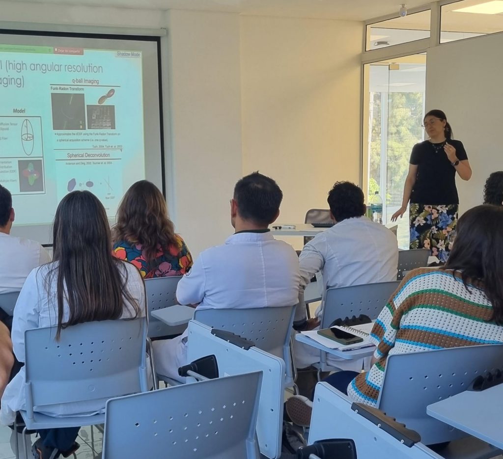 Durante su presentación, la investigadora compartió avances en el estudio de las fibras de asociación corta mediante técnicas de tractografía basadas en resonancia magnética, un enfoque que permite profundizar en la comprensión de la conectividad cerebral y sus posibles aplicaciones tanto en la investigación básica como en el ámbito clínico.